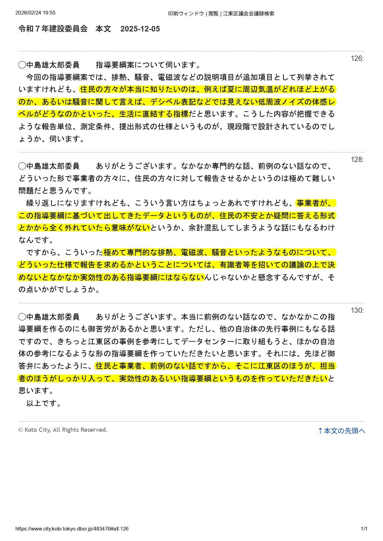 第三に、区議会によるチェック機能が構造的に弱体化するということです。 私はこれまでの計6回の説明会のうち4回に参加し、現場で何が起きているかを確認してきました。今後、区議会の建設委員会等でこの問題を取り上げ、要綱の運用実態を問うことになります。