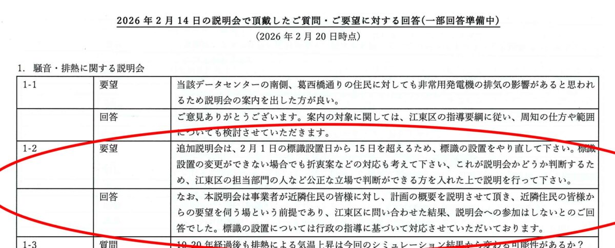 これは推測ではありません。2月14日の説明会で住民が「江東区の担当部門の人など、公正な立場で判断ができる方を入れた上で説明を行って下さい」と要望したのに対し、事業者は「江東区に問い合わせた結果、説明会への参加はしないとのご回答でした」と書面で回答しています。