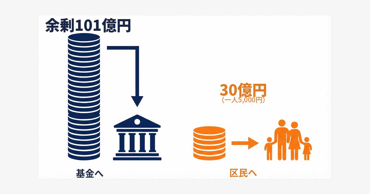 一方で、第4号補正で計上された全区民への給付額は5,000円相当(予算規模約30億円)。千代田区・足立区・港区など近隣自治体が1万円相当の給付を行う中、本区はその半額にとどまりました。仮に1万円に引き上げても追加コストは約30億円で、それでもなお70億円以上の余裕がある計算です。