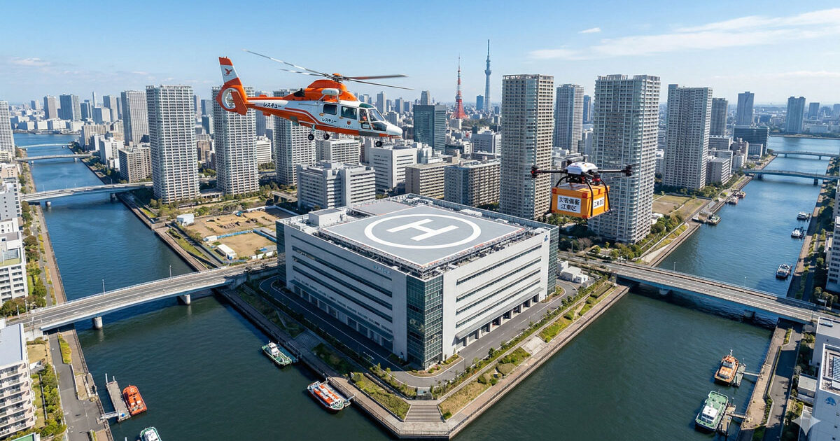 港区はお台場への1.8kmドローン物資輸送を実証済み。三井不動産は日本橋のビル屋上に常設ドローンポートを構築しています。