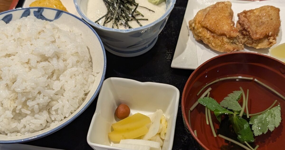 ご飯の量はやや多め。そこで唐揚げ(+250円)を追加しましたが、これが正解。外はカリッと香ばしく、中はふっくらジューシーで、素朴ながら完成度の高い一品です。山かけのとろろはなめらかで、海苔と薬味が程よく効き、白いご飯が進みます。
