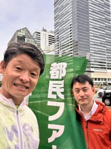 白戸太朗都議と門前仲町の赤札堂深川店前と東陽町の西友前で街宣活動を行い…