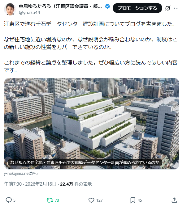 江東区千石の住宅地に大規模データセンターの建設計画が持ち上がった問題について、住民説明会への参加、区の要綱の課題分析、東京都への働きかけなど、一貫して取り組んできました。
